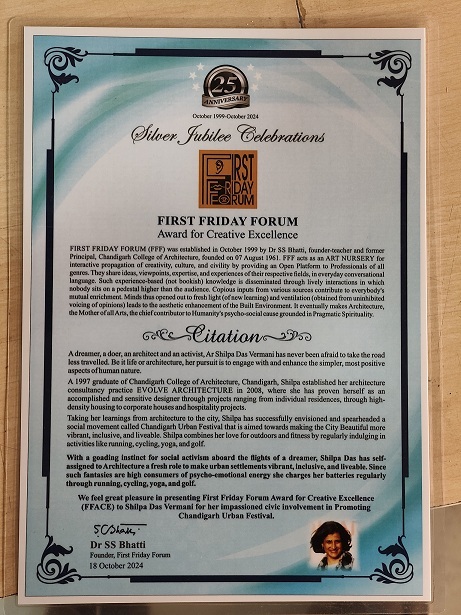 Honoured at the First Friday Forum for Creative Excellence by Dr. S. S. Bhatti at Chandigarh College of Architecture on 18th October 2024.