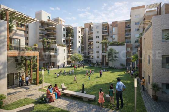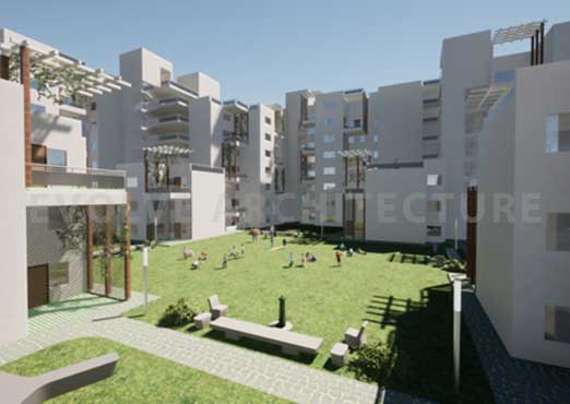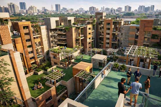The planning strategy responds sensitively to social, cultural, and climatic contexts, ensuring inclusivity, safety, and comfort across diverse user groups. Dwelling units are organised around a hierarchy of tiered, usable green terraces that transition from private spaces to semi-public shared areas and larger public community courts. This gradation allows for individual privacy while encouraging collective living, informal interactions, and community ownership of shared spaces.