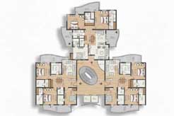 The typical floor plan is designed around a central core with an elegant oval staircase and lift lobby that efficiently distributes access to multiple apartments on each level. Each unit is planned with a clear zoning of living, dining, kitchen, and bedroom areas, ensuring privacy and functional flow. Balconies extend living spaces outward, offering views toward landscaped areas and improving cross-ventilation within the apartments.