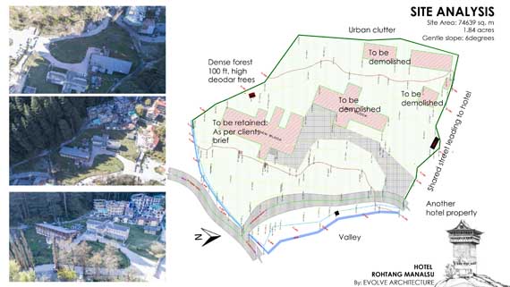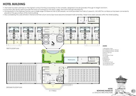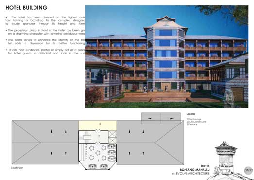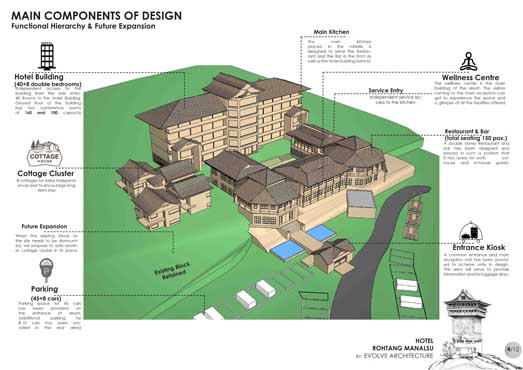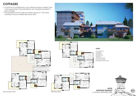 Landscape is treated as an integral architectural element, with entrance courts, central courtyards, sun decks, and forest-edge kiosks providing spaces for both social interaction and solitary retreat. Passive design strategies, including orientation, shaded walkways, deep balconies, and thermal mass, respond to Manali’s cold climate while reducing energy dependence. Universal accessibility is seamlessly integrated throughout the site, ensuring inclusivity at every level.