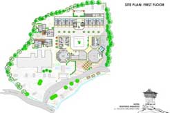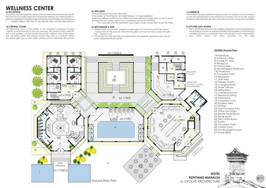 The master plan organizes the complex into clearly defined yet interconnected zones comprising the wellness centre, hotel block, restaurant and bar, conference facilities, and cottage clusters. These components are arranged around a sequence of courtyards, pedestrian plazas, and sun-oriented outdoor spaces, allowing movement to unfold gradually and experientially. The wellness centre forms the core of the project, housing ayurveda, panchkarma, water therapy, yoga, and meditation spaces. These areas are designed to engage with natural light, framed views of the valley, and visual connections to the surrounding forest, reinforcing a sense of calm and introspection.