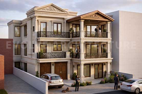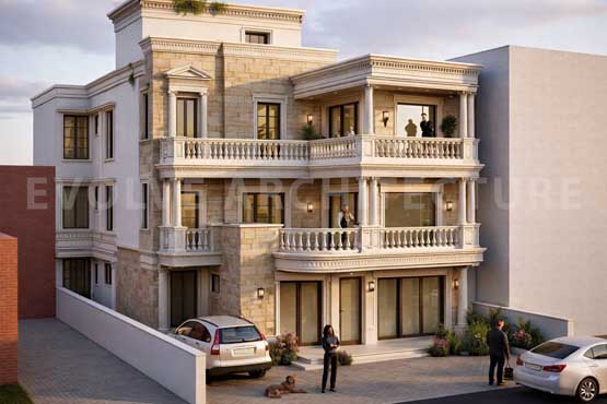 The residence is designed in a Neo-Classical architectural style, reflecting timeless elegance, symmetry, and refined detailing. The façade composition emphasizes balanced proportions, with vertically aligned openings, strong horizontal cornice bands, and articulated mouldings that create a sense of grandeur and permanence. The design integrates classical elements such as decorative pilasters, ornamental cornices, and arched openings at the lower level, establishing a sophisticated visual hierarchy