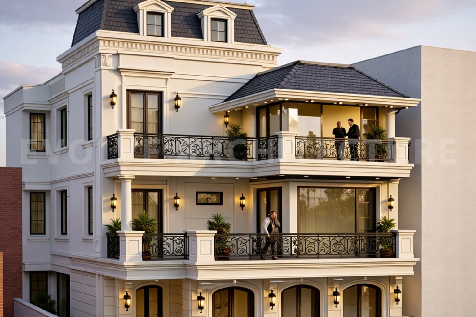The mansard-inspired roof form with dormer windows adds a distinctive European character while enhancing the overall massing of the structure. Wrought iron railings with intricate patterns accentuate the balconies, reinforcing the classical aesthetic while maintaining visual lightness. Large windows and glass openings ensure adequate natural illumination, blending traditional architectural expression with contemporary living requirements.