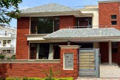 The residence is conceived as a contemporary villa that integrates modern architectural expression with the warmth and permanence of exposed brick. The design is articulated through a composition of interlocking rectilinear volumes, where strong vertical brick elements are balanced by horizontal bands, balconies, and roof overhangs. Sloping tiled roofs lend a softer silhouette to the structure while responding effectively to climatic conditions such as rainfall and solar exposure. Large glazed openings and recessed windows are strategically placed to maximise natural light, cross-ventilation, and visual connectivity with the surrounding landscape. Light-coloured plastered surfaces contrast with the red brick, enhancing depth and proportion across the elevations. The boundary wall, entrance gate, and landscape elements echo the primary material palette, ensuring a cohesive relationship between built form and site. Overall, the architecture reflects a refined residential character that is contextually responsive, climatically sensitive, and grounded in honest material expression.