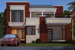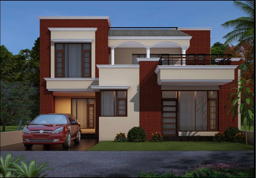 This contemporary residence presents a balanced composition of modern massing with subtle classical cues. The façade is articulated through a strong interplay of exposed red brick and smooth cream plaster, creating depth and visual contrast. Clean horizontal bands, projecting balconies, and crisp cornice lines lend the house a refined, structured character. Arched openings on the first-floor veranda soften the geometry and introduce a sense of elegance, while large fenestrations ensure ample daylight and visual connection with the outdoors. The entrance porch is understated yet welcoming, seamlessly integrated with a covered car parking bay. Dark-toned window frames and metal railings add sharp accents against the warm material palette. The flat roof terraces enhance usability while maintaining a low, urban profile. Landscaped greens at the front soften the built form and frame the house within its setting. Overall, the design reflects a practical yet aesthetically grounded residential architecture, suited to a modern lifestyle while retaining a timeless appeal.
