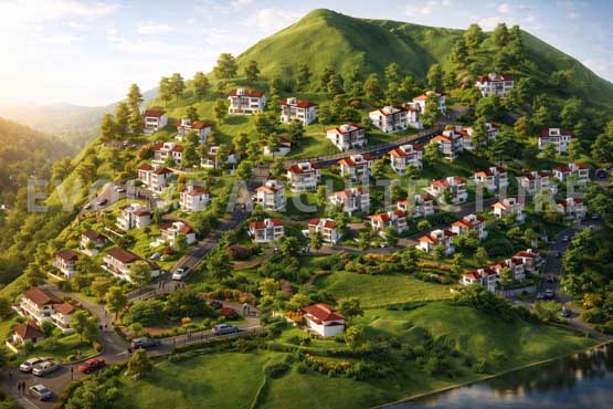 This project envisions a sustainable hillside residential community that harmoniously integrates architecture with the natural terrain and ecological context. The development is designed as a cluster of low-rise cottages and residential blocks carefully positioned along the natural contours of the site, minimizing land disturbance while maximizing panoramic views, sunlight, and ventilation. The planning strategy emphasizes responsive land use through terraced construction, retaining walls, and contour-aligned road networks that significantly reduce excessive cutting and filling of the slope.